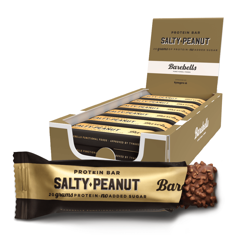 Her får du en hel kasse med 12 styk af Barebells Salty Peanut med 55 gram per bar.