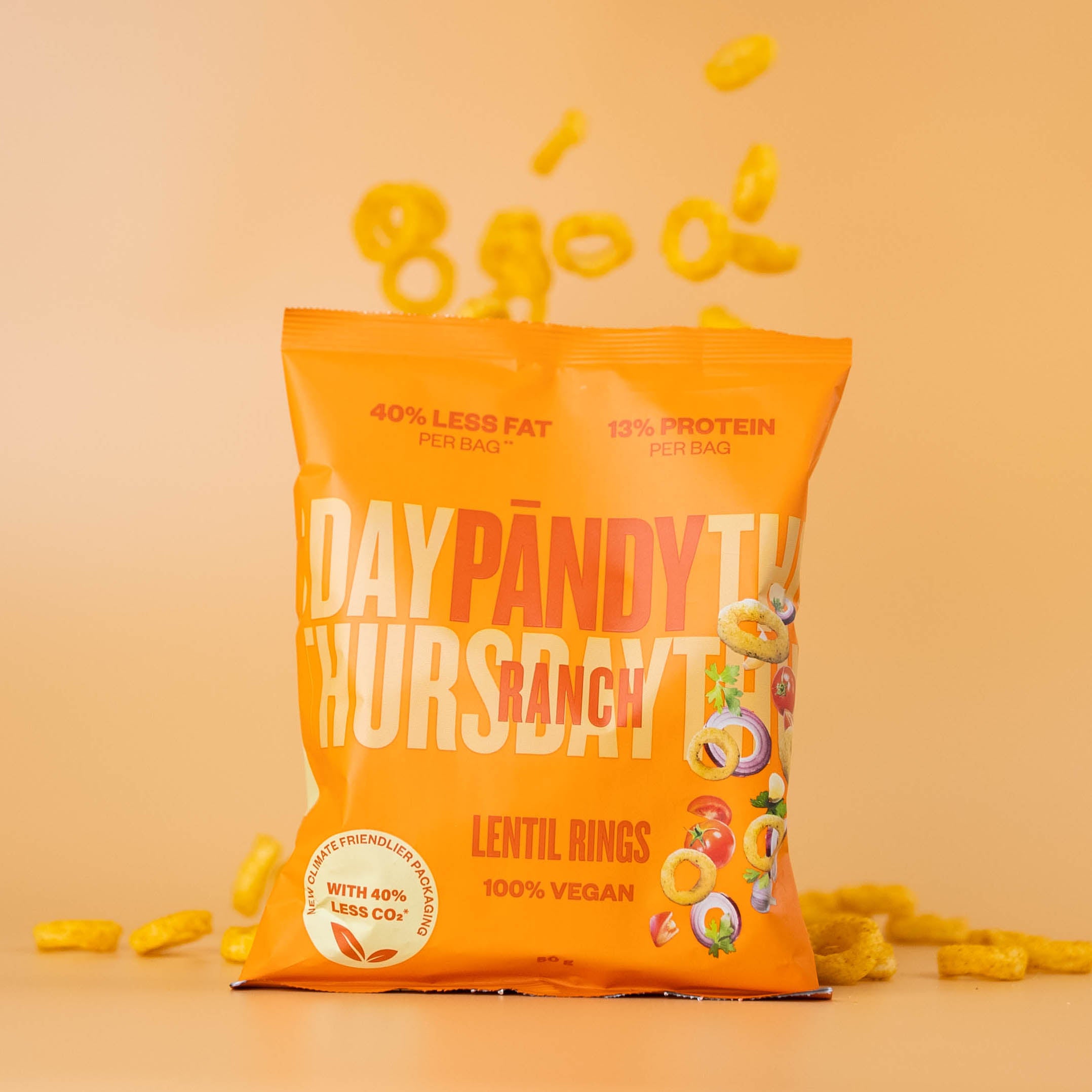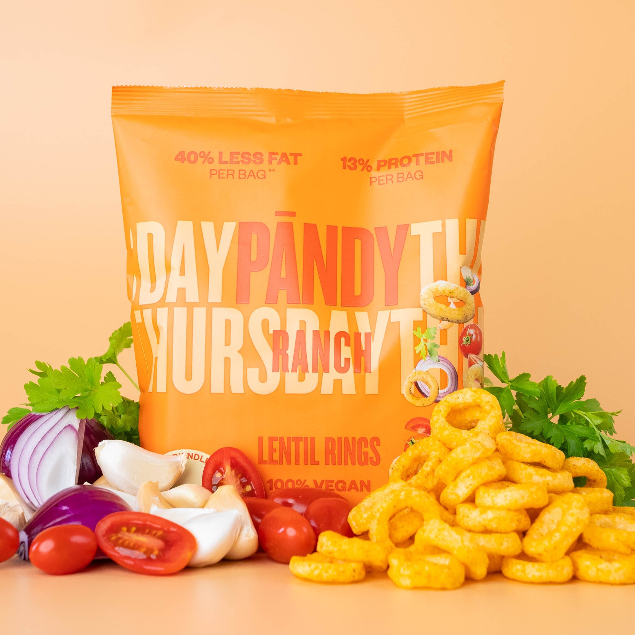 Ranch Lentil Rings fra PANDY er muligvis din kommende afhængighed. Chips med masser af smag, men med under 10g fedt pr. pose. En kalorielet og vegansk snack - lige til at tage med på farten!