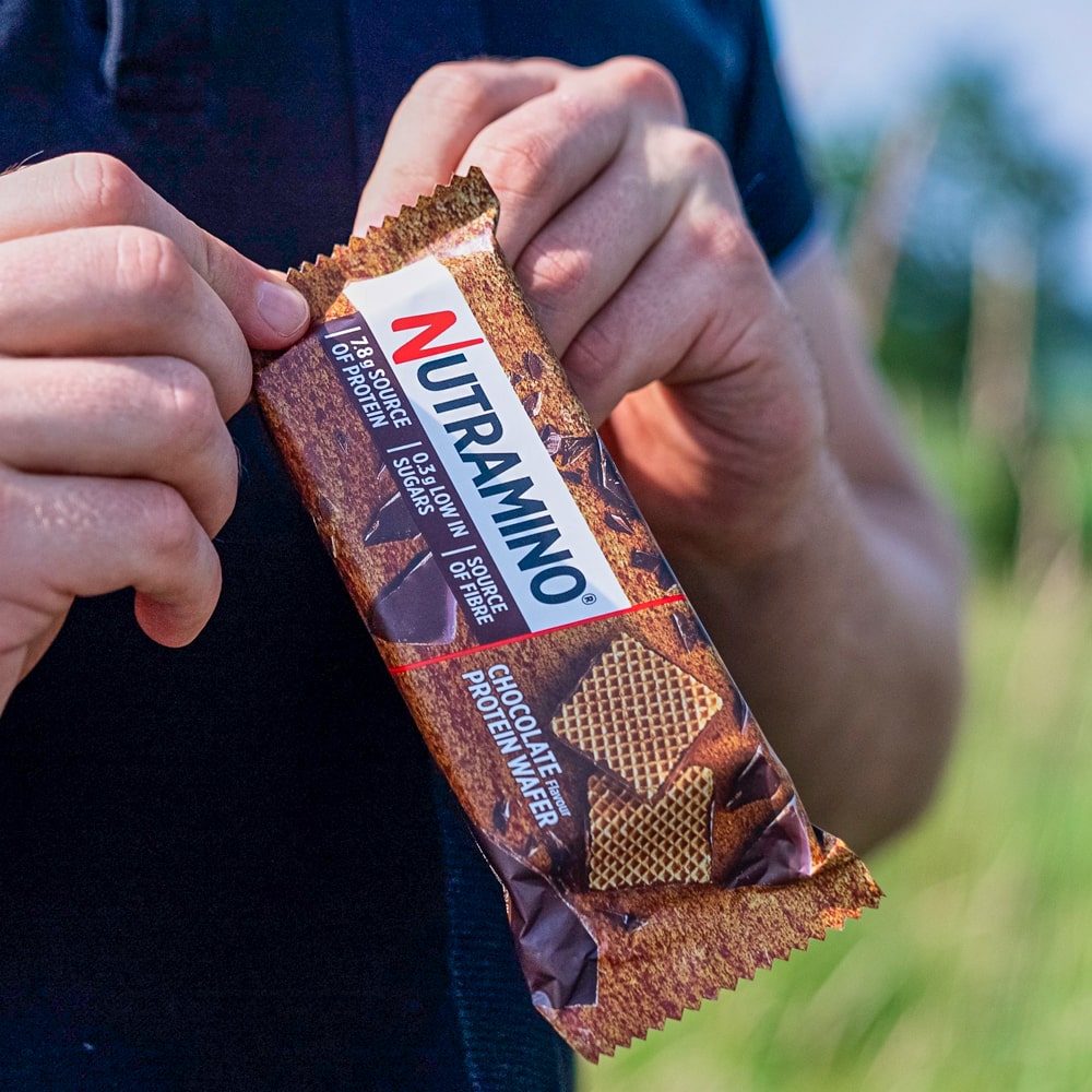 Uimodståelig vaffel fra Nutramino! Hver pakke indeholder 2 lækre og crispy vafler, med et crunchy lag sukkerfri chokolade i midten, i en handy snack-pack indpakning.