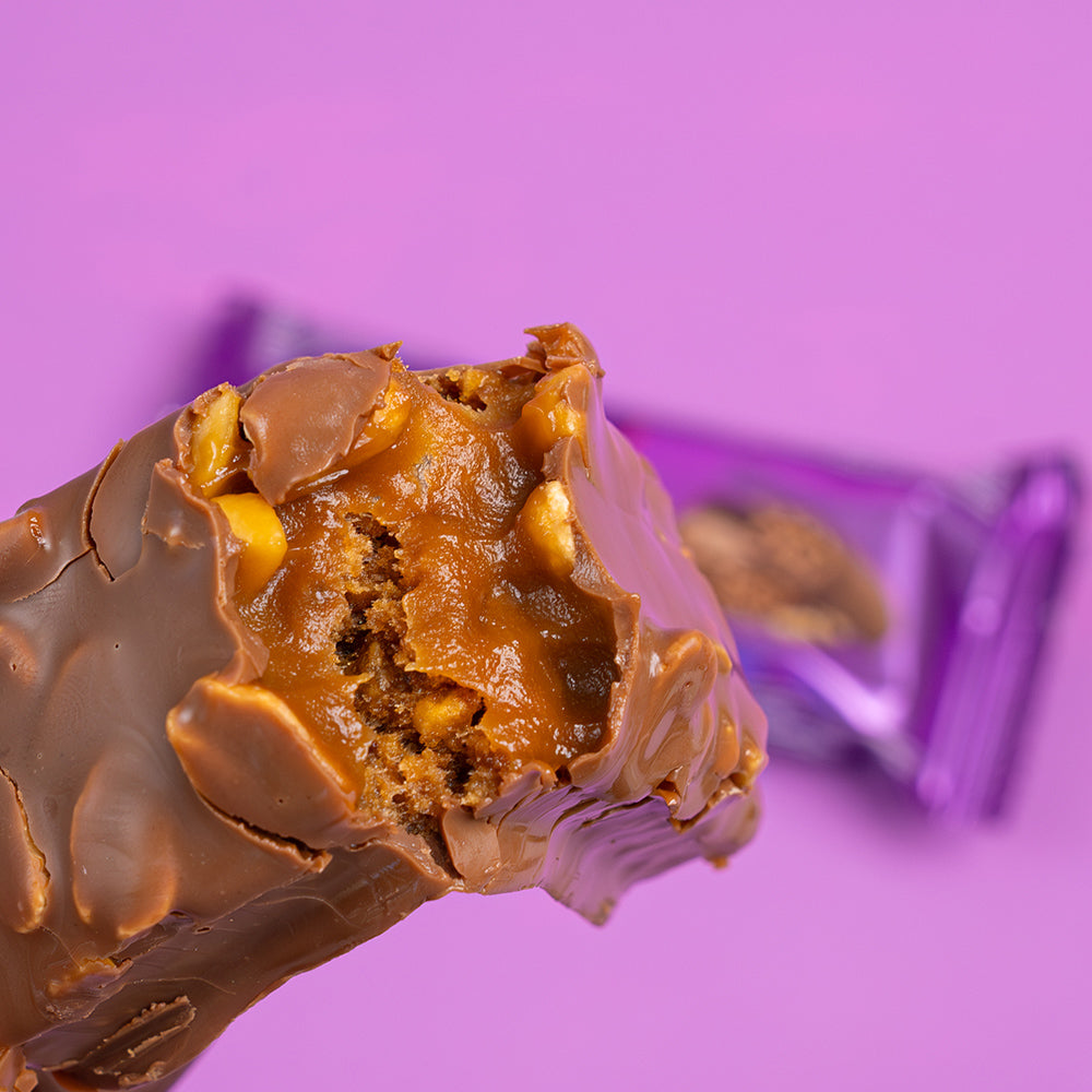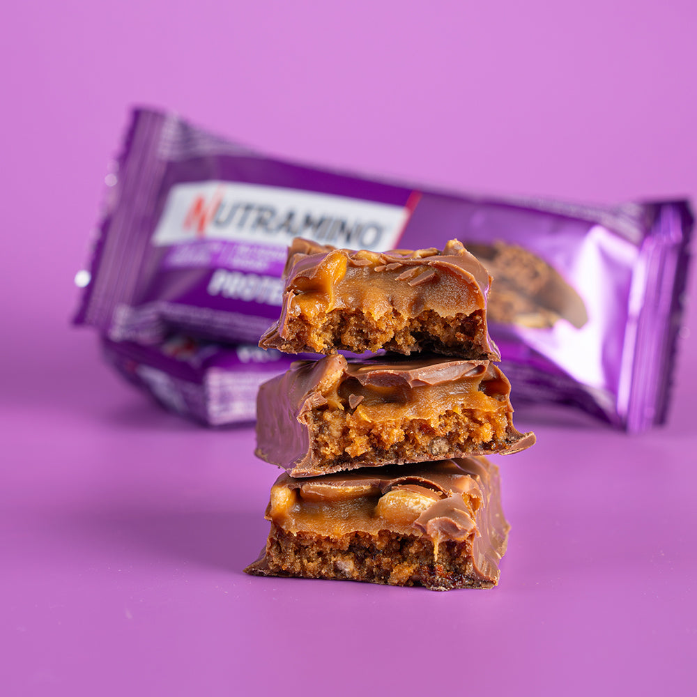 Lækker Nutramino Proteinbar med Chunky Peanut & Caramel! Baren har en protein kerne med vaniljesmag, og er overtrukket i knasende chunky peanut stykker og blød karamel!
