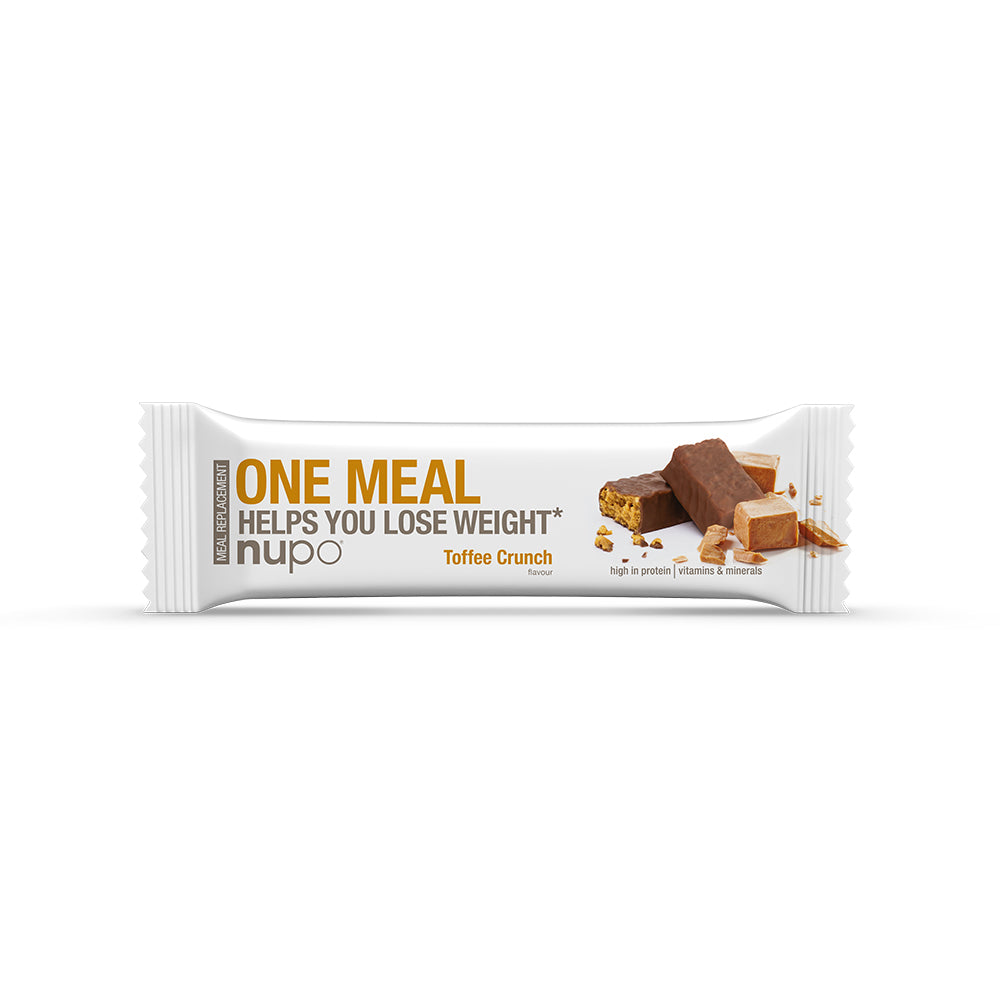 Nupo Meal Bar (60g) - Toffee Crunch er en crunchy og velsmagende bar med en intens smag af karamel kombineret med sprøde puffede sojacrisps, overtrukket med en skøn chokolade. Nupo Meal baren er rig på smag og har et højt protein- samt fiberindhold og tilmed alle de vitale vitaminer og mineraler for kun 219 kcal.