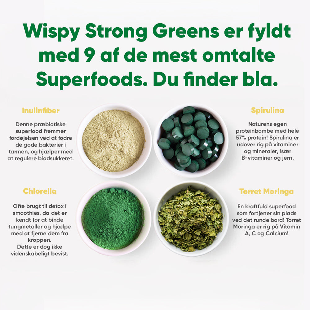 Tørret spinat, inulin, citronsaftpulver, syre (æblesyre), hvedegræsekstrakt, tørret spirulina, tørret broccoli, byggræs, aromaer, brændenældeekstrakt, tørret chlorella, tørret moringa, sødemidler (sukralose, acesulfamkalium). |