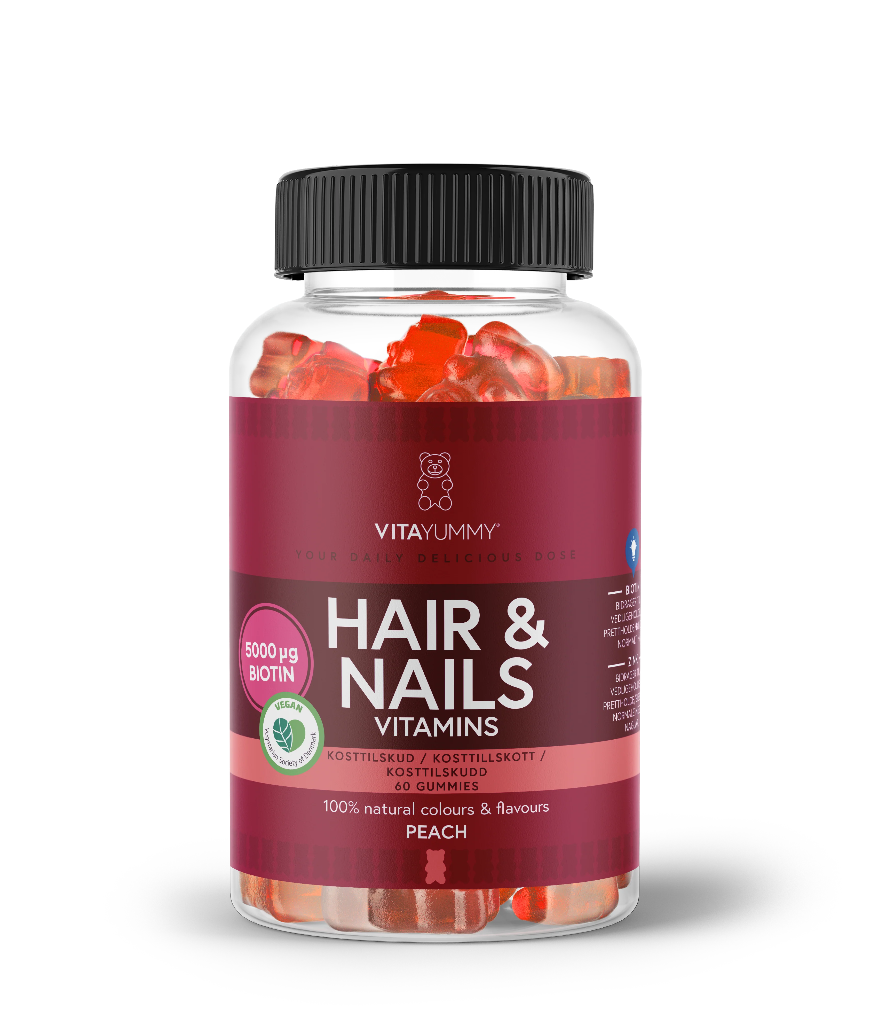 Hair & Nails fra VitaYummy er til dig der ønsker at forkæle dit hår og dine negle ekstra meget. VitaYummy Hair & Nails Raspberry indeholder vitamin A, B (B5, B12 og biotin), C, D, E og mineralerne zink og jod. Biotin er med til at vedligeholde normalt hår og negle, et normalt stofskifte samt normal omsætning af makronærringstoffer. Zink bidrager også til normalt hår og negle. Derudover er det med til at beskytte cellerne mod oxidativt stress. Vitamin A bidrager til vedligeholdelsen af normal hud. Vitamin B5 og jod bidrager til et normalt stofskifte. Vitamin B12 og vitamin D bidrager til celledelingsprocessen. Vitamin C og E beskytter cellerne mod oxidativt stress.