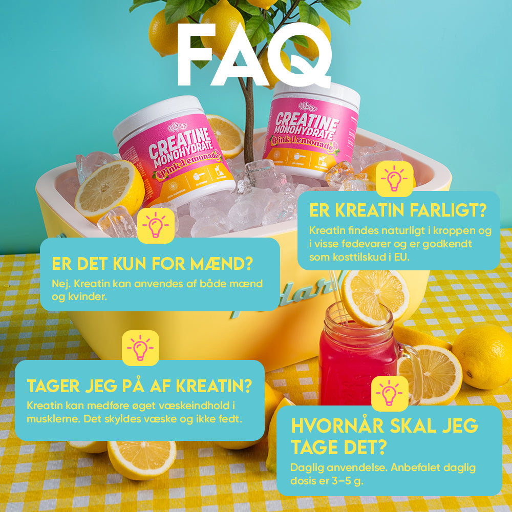 Kosttilskud Kreatin-kosttilskud med smag af Pink Lemonade. Dagsdosis bør ikke overskrides. Kosttilskud bør ikke træde i stedet for en varieret kost. Opløses i 200–300 ml vand, juice eller anden væske. |
